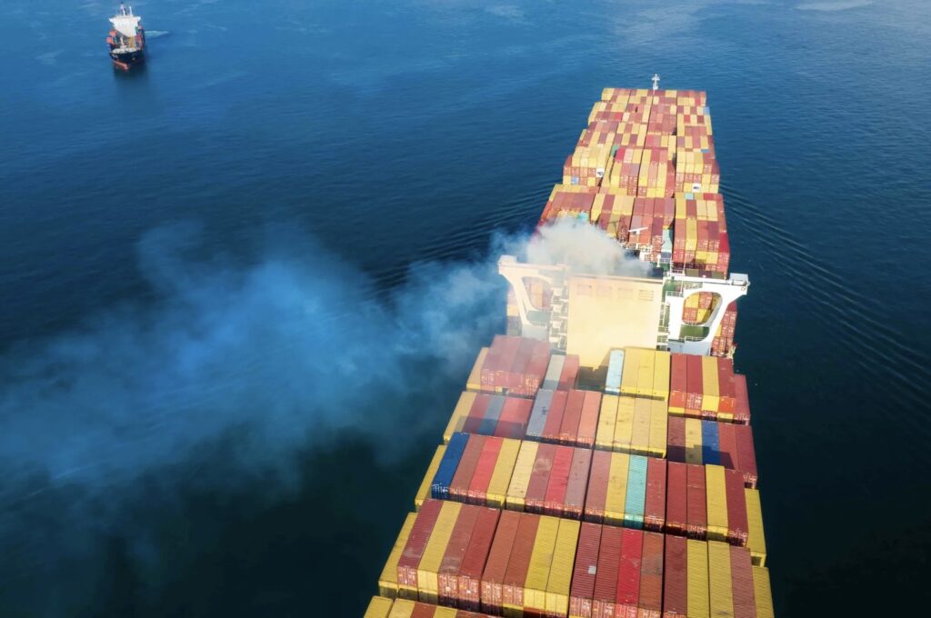 Depending on how fast it travels each 13,000 TEU container ship uses roughly 70 to over 125 tonnes of fuel per day during the 12 – 16 sailing across the Pacific. The international shipping industry is responsible for ~3% of global CO2 emissions. Container ships contribute about 30% of these emissions.