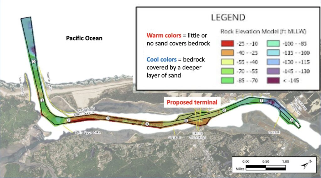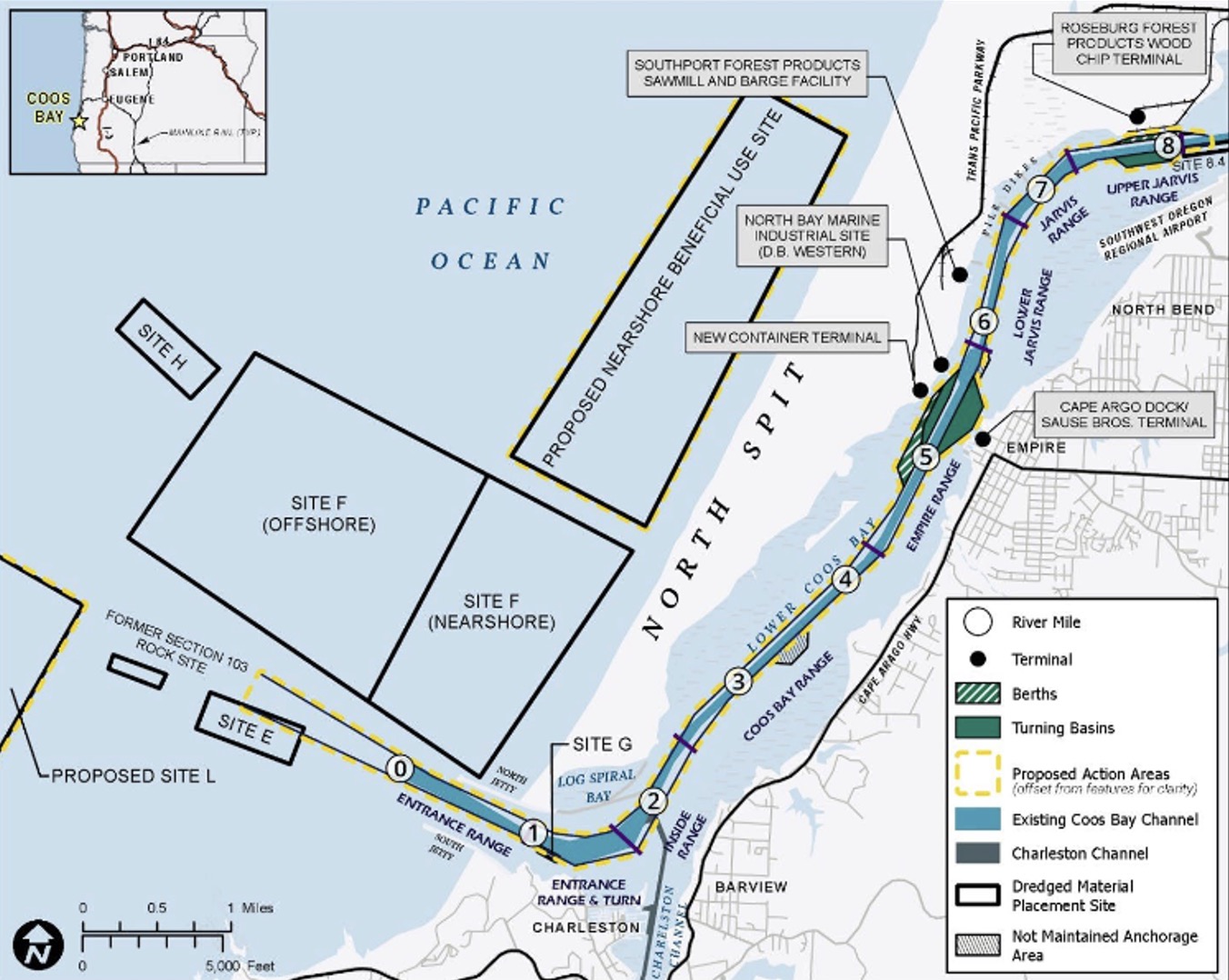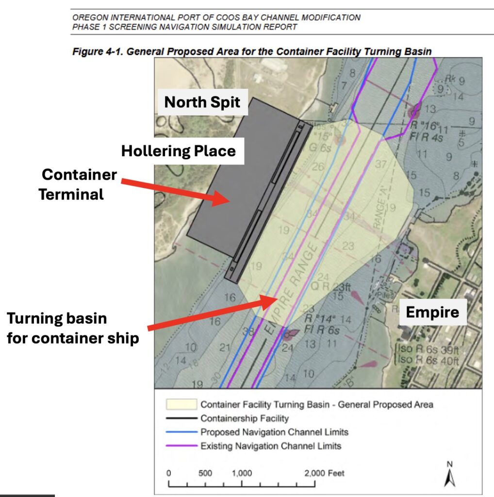 The permit request for this project to the USACE shows that 8.2 miles of the channel will be expanded, even though the shipping terminal would be located only 5 miles from the ocean. In addition to the channel expansion two turning basins are planned. One in front of the terminal so ships coming in can turn around to leave. The footprint of the this turning basin shows shows that it would stretch almost bank to bank from the North Spit to the community of Empire. Additionally the Coos Indian villages of Waikdee, Hanistitch, Intesitch, and Walitch were located along the shore here. The place across the bay from these villages, where the terminal would be located, is known as the Hollering Place. Travelers arriving on the North Spit shore would holler over to the villages for someone to paddle over and pick them up in their canoes.
