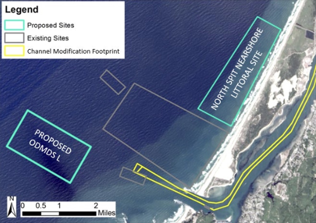 A 2.3 square mile ocean area off of Sunset Beach would be the dumping area for both rock and sand. The second 1,000 acre site, close to the shoreline north of the jetty entrance, would only be used for sand disposal in calm weather as it is too close to shore for the dredge to safely access it in rougher weather.